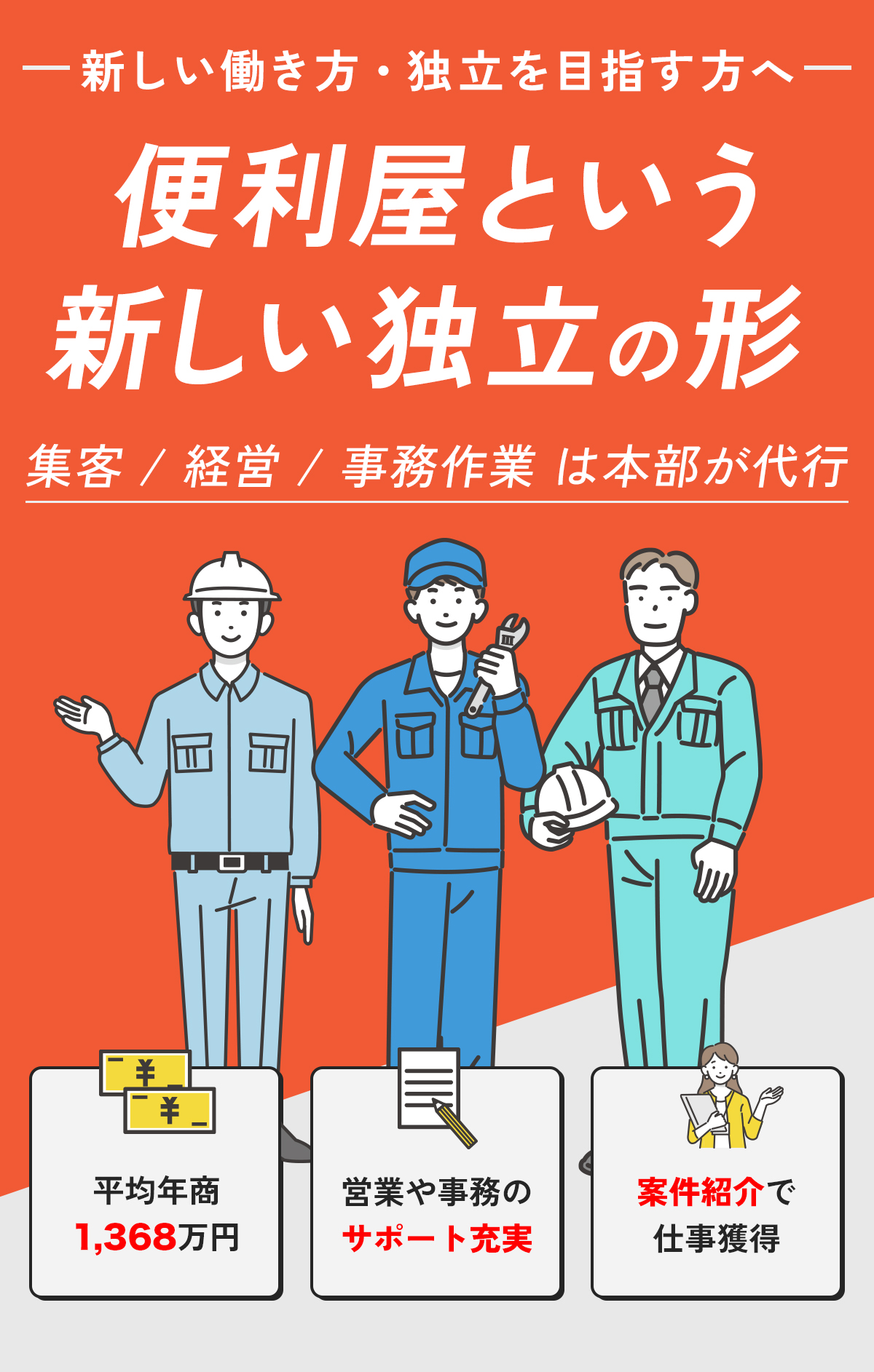 本部が広告運用や営業代行を行い、依頼を獲得します。 獲得した案件はオーナーのエリアや対応可能な作業内容に応じて紹介します。