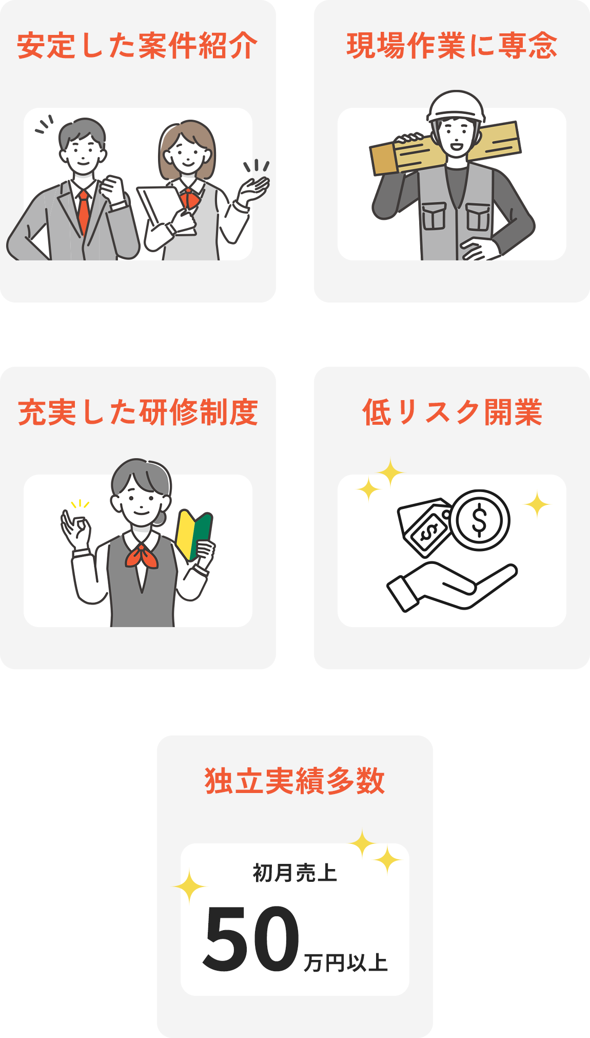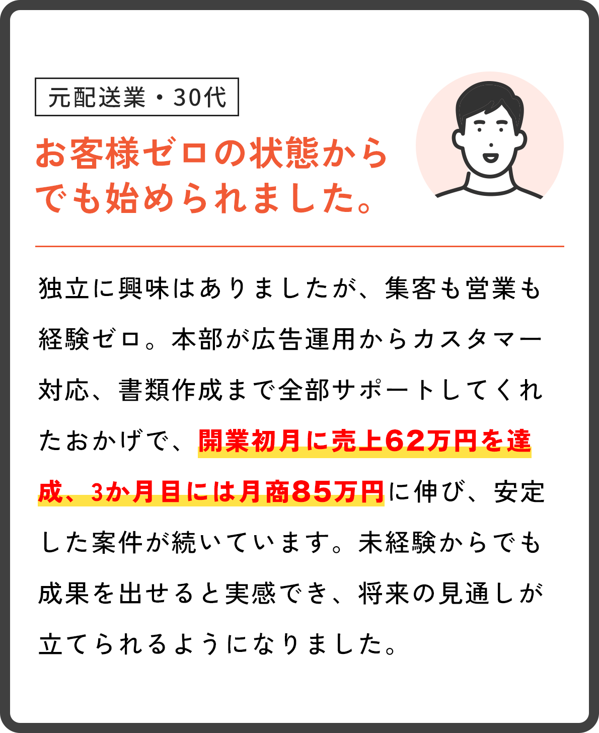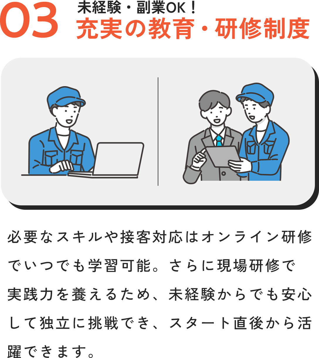 はい。現在活動しているオーナーの多くが未経験からのスタートです。 本部が集客代行、顧客対応、書類作成、税務サポートまで行うため、現場作業に専念できます。 実際に未経験から初月50万円以上を達成した事例も多数あります。