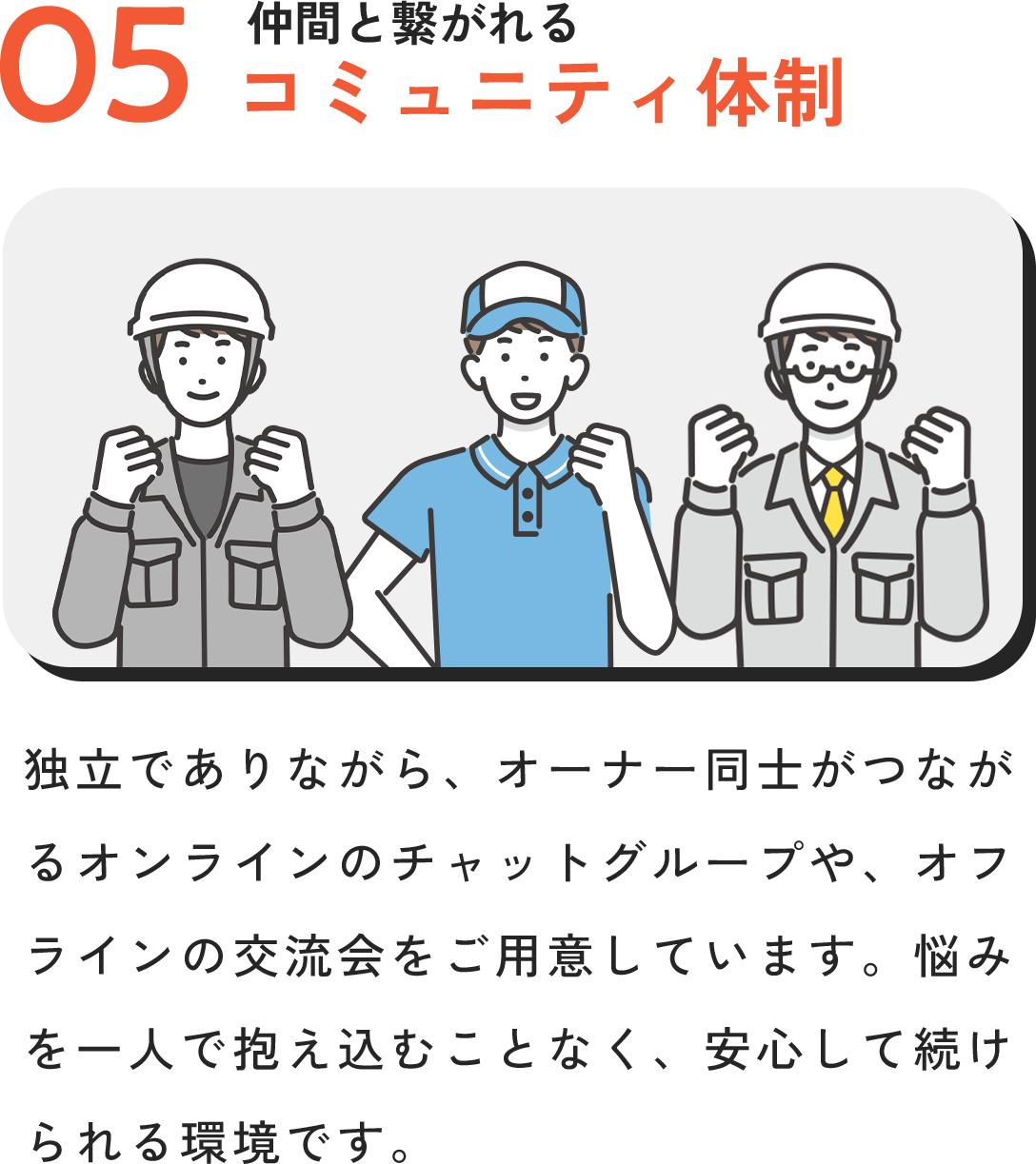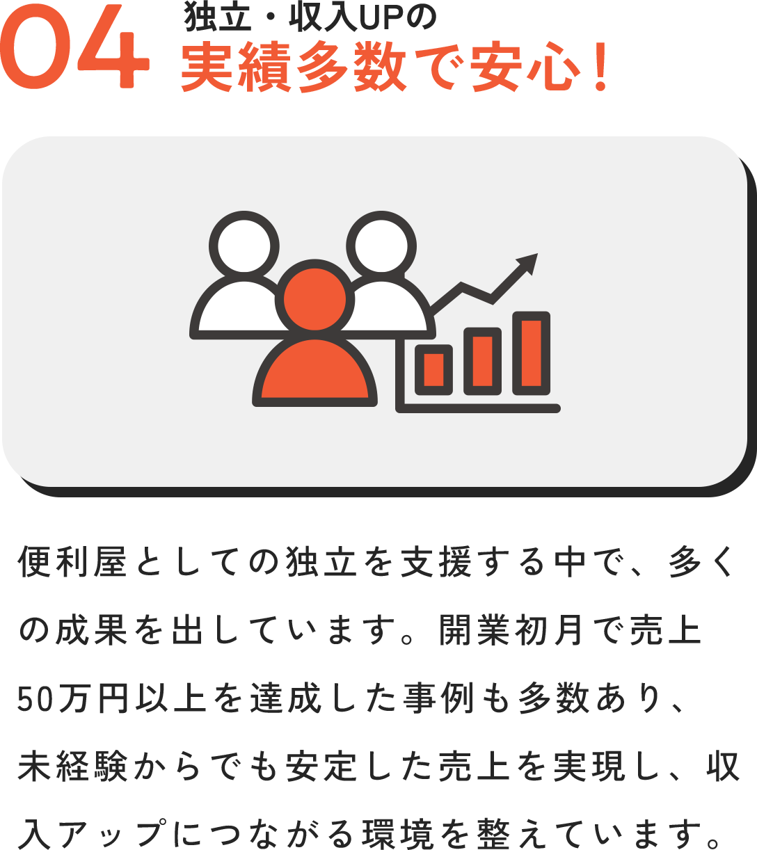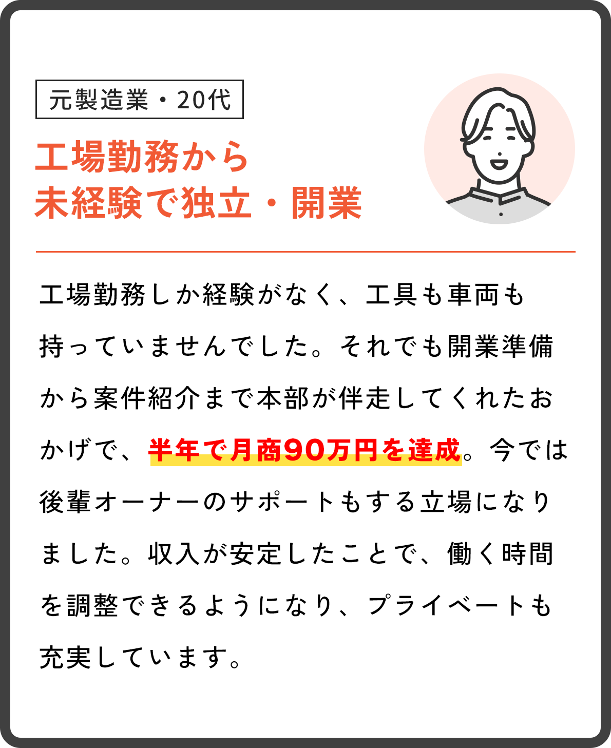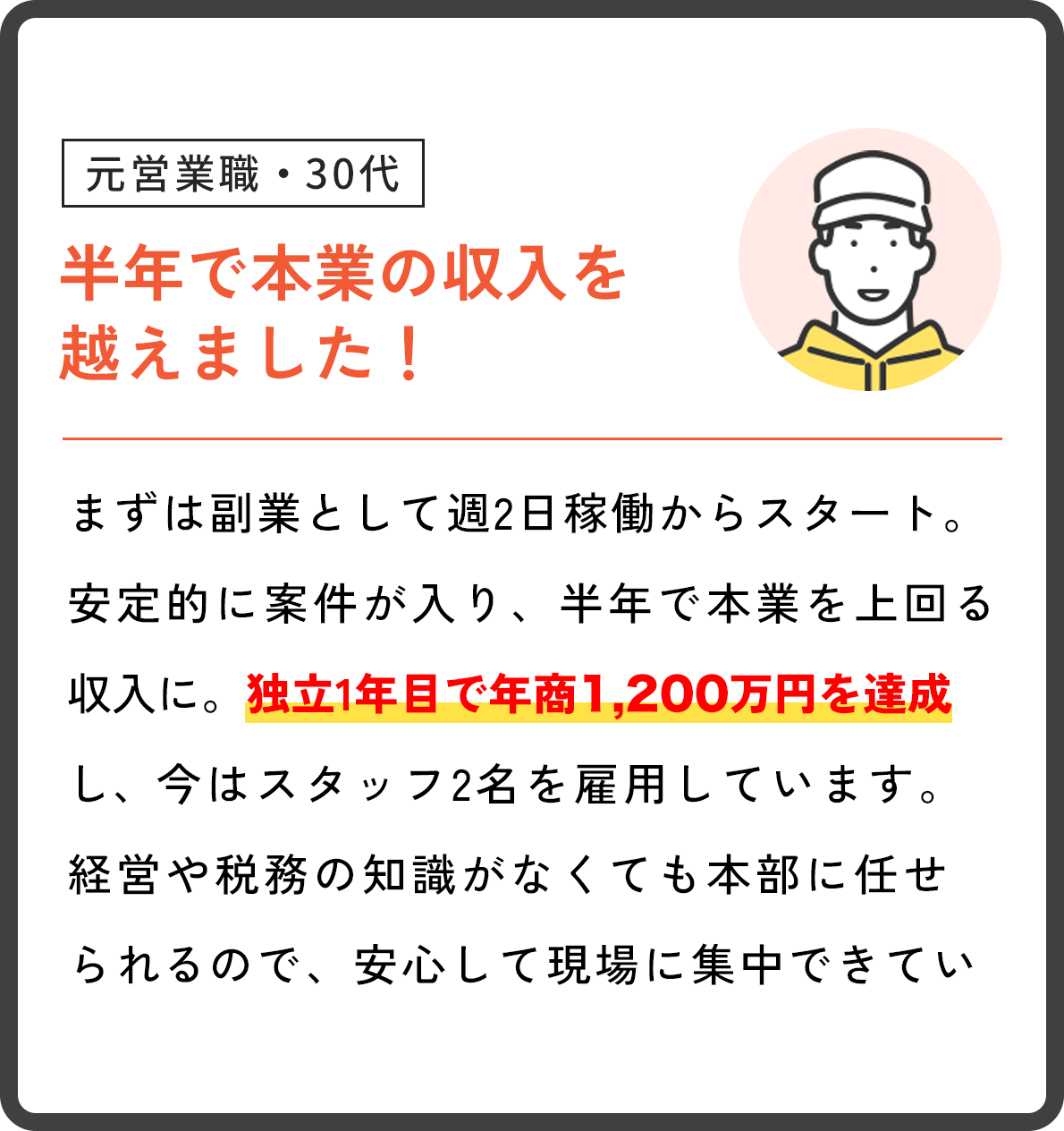 はい。現在活動しているオーナーの多くが未経験からのスタートです。 本部が集客代行、顧客対応、書類作成、税務サポートまで行うため、現場作業に専念できます。 実際に未経験から初月50万円以上を達成した事例も多数あります。