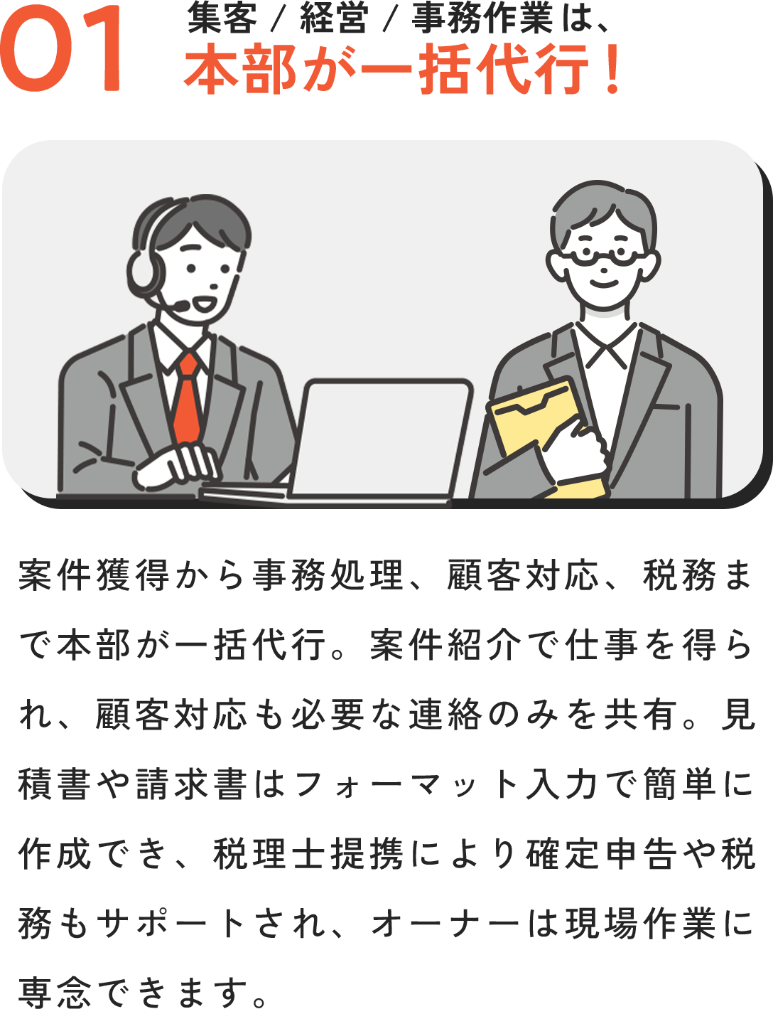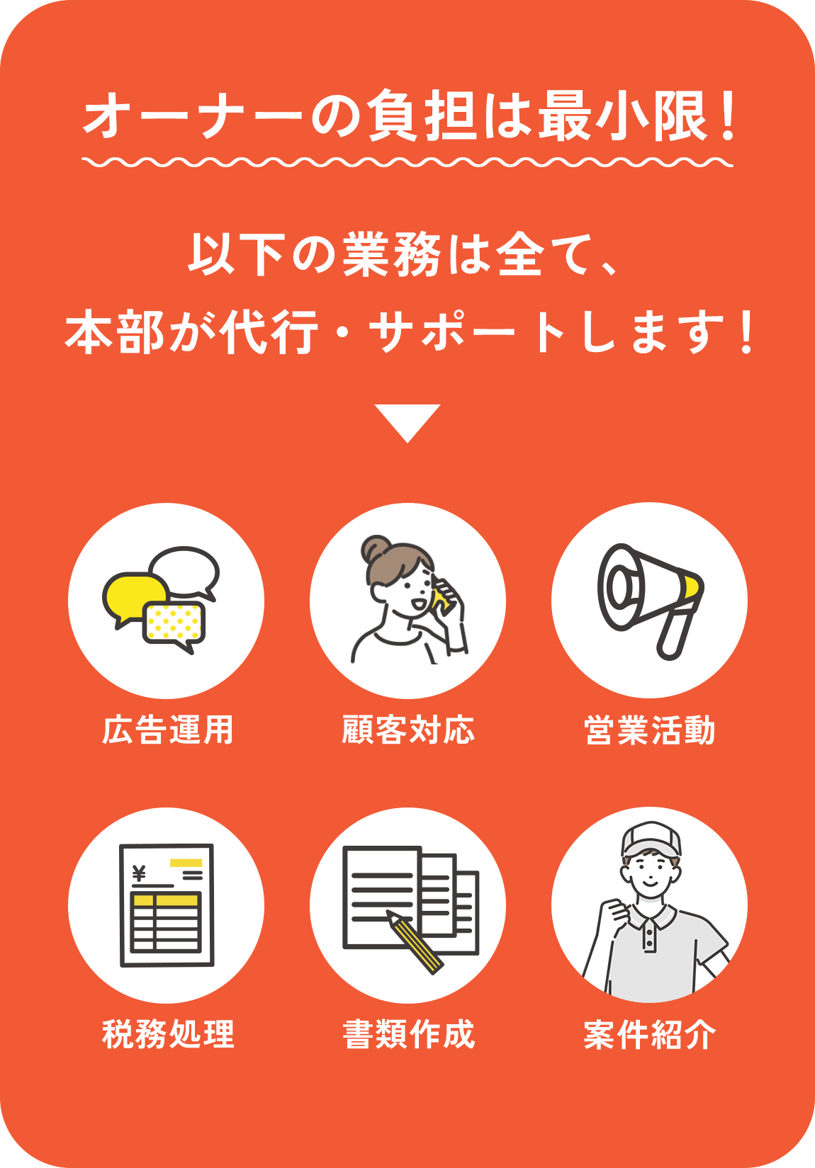 本部が広告運用や営業代行を行い、依頼を獲得します。 獲得した案件はオーナーのエリアや対応可能な作業内容に応じて紹介します。