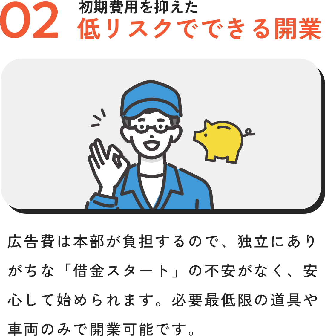 必要最低限の道具や車両のみで開業できます。初期費用を抑えてスタートできるため、低リスクでの独立が可能です。